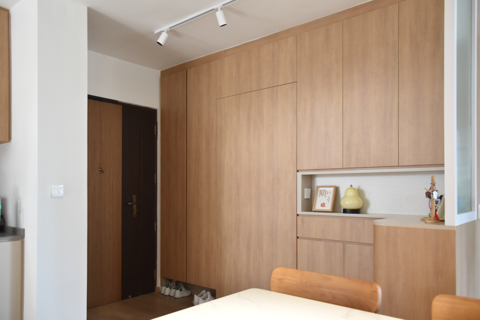 Step into a space inspired by the minimalist aesthetic of Muji, the space harmonizes mid-tone wood accents and soothing neutral tones, creating a serene ambiance. Enhanced by the warmth of wood vinyl flooring.